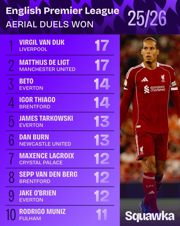 9月3日讯 数据机构squakwa统计了新赛季英超球员成功争顶情况,两位荷兰中卫并列榜首。