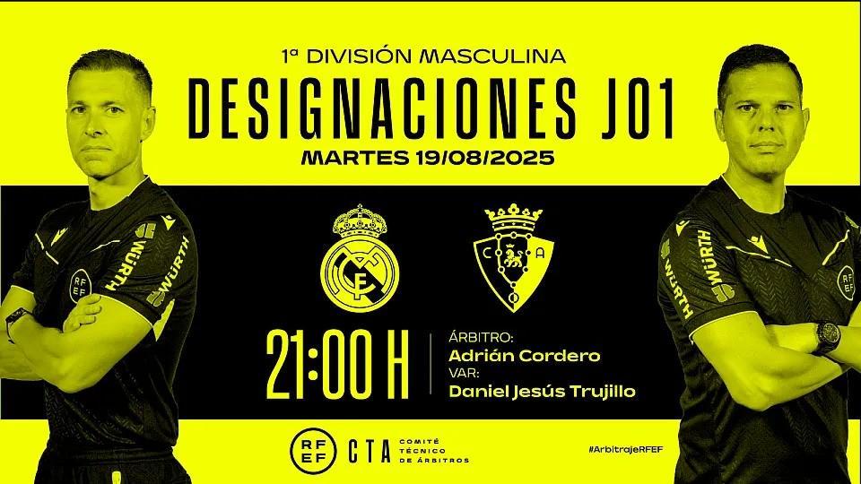 今日,西班牙足协公布了8月19日进行的一场西甲比赛的裁判,即皇家马德里主场对阵奥萨苏纳的比赛。阿德里安-科尔德罗将担任主裁,VAR是丹尼尔-特鲁希略。