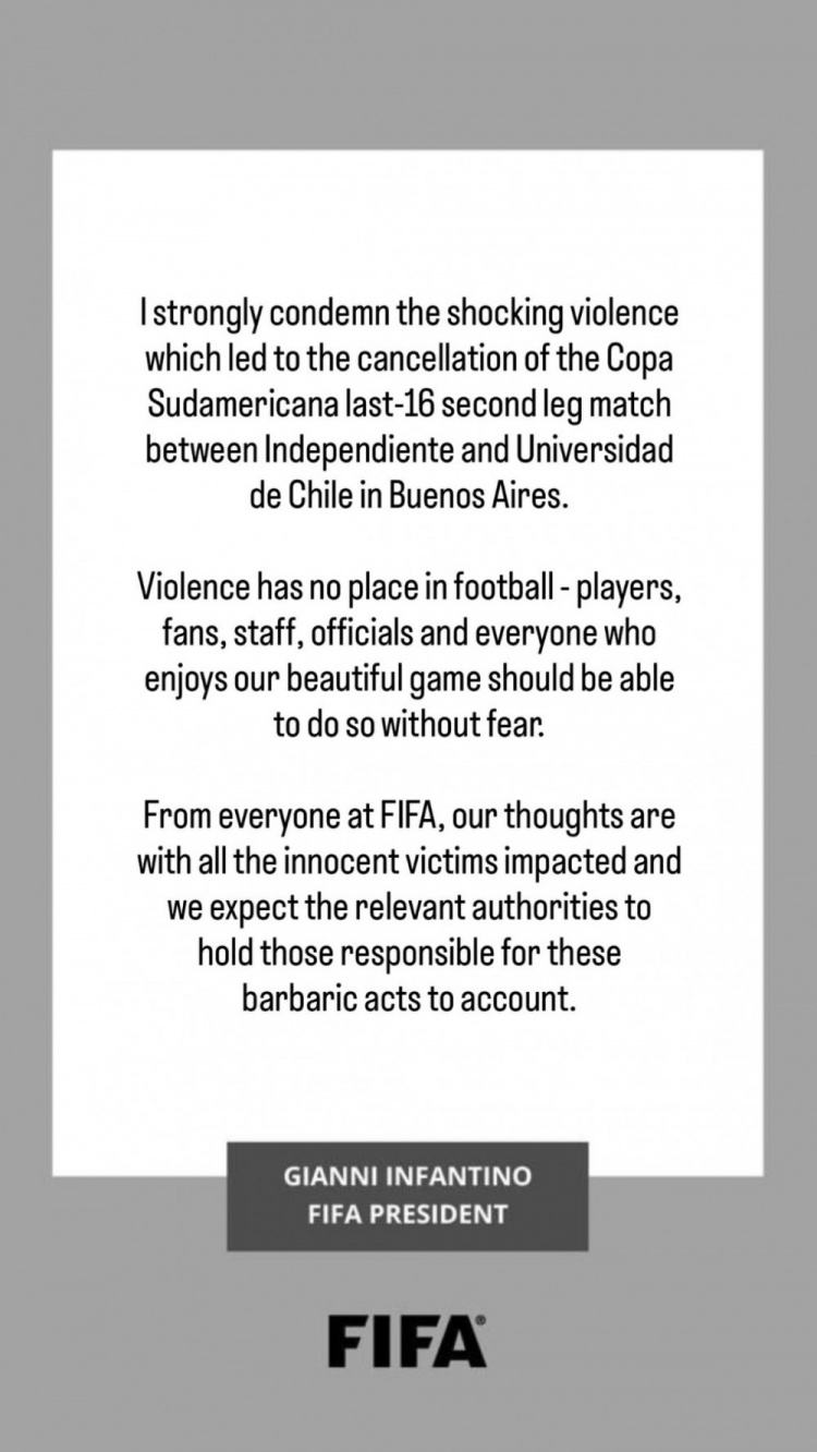 国际足联主席因凡蒂诺社媒谴责暴力行为,他写道:“我强烈谴责导致阿根廷独立队与智利大学队在南美杯16强次回合比赛取消的令人震惊的暴力事件。